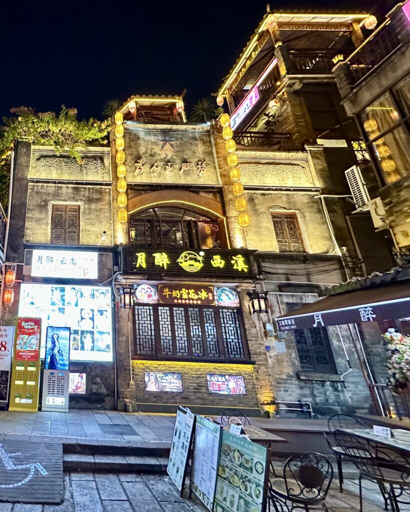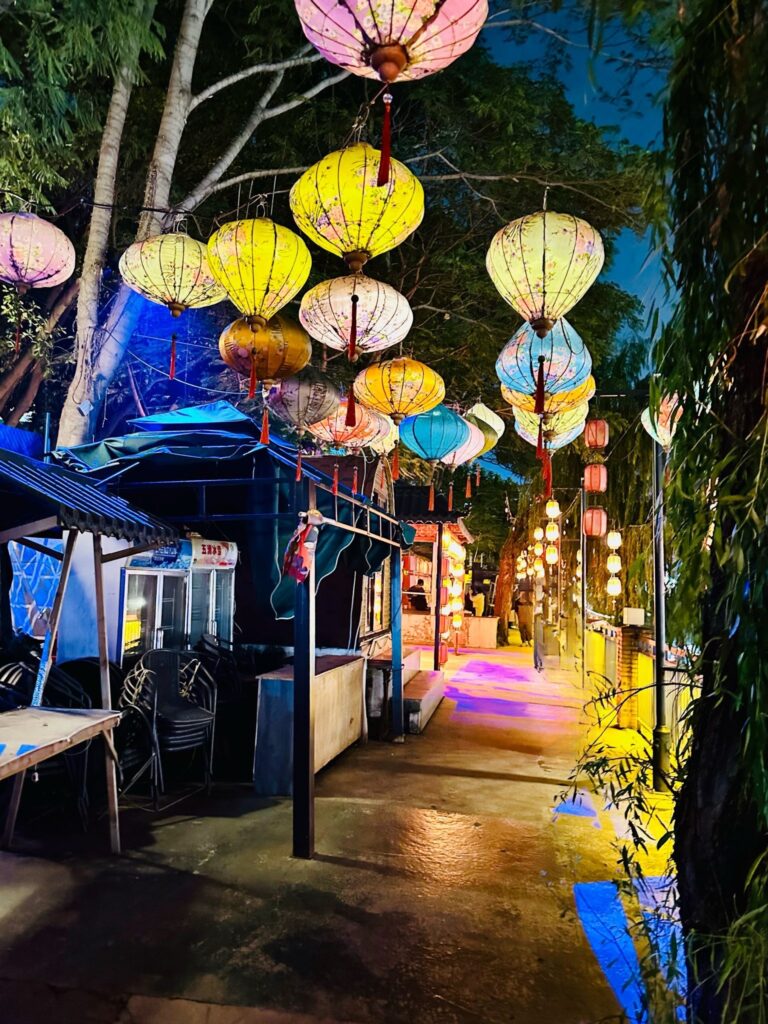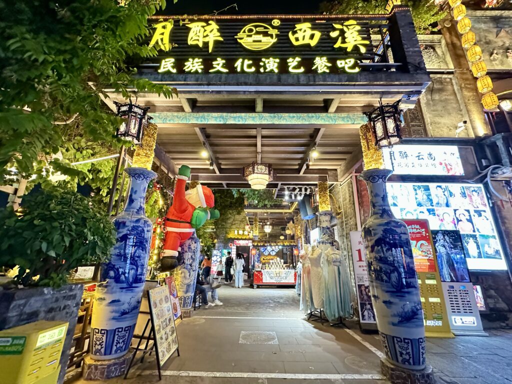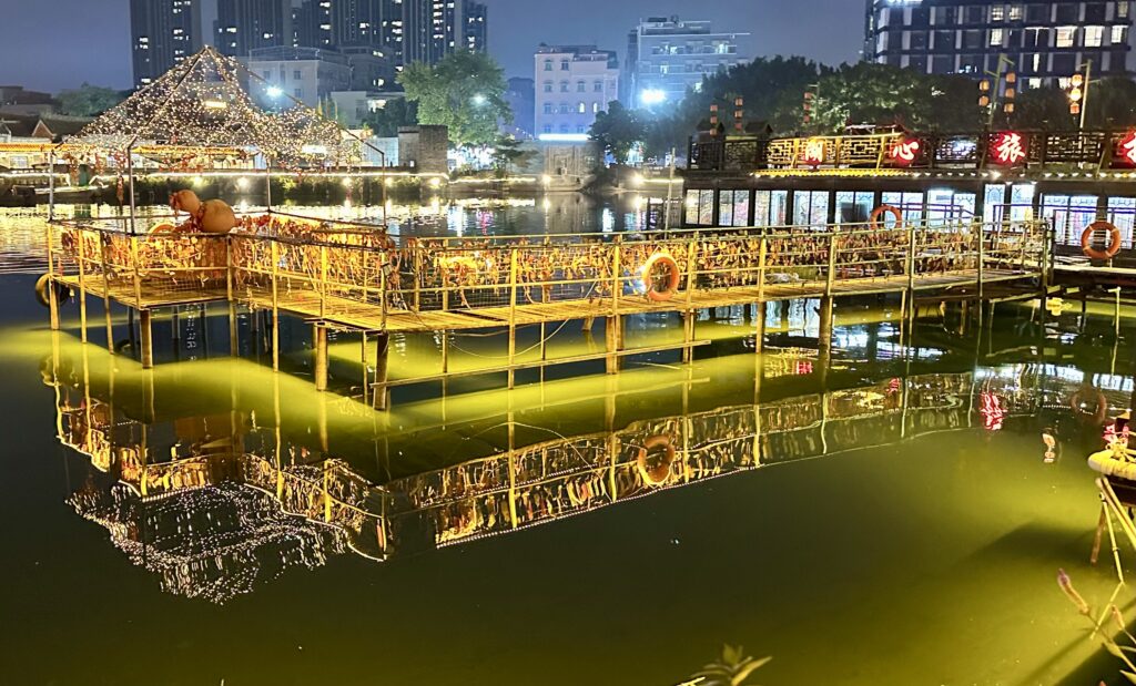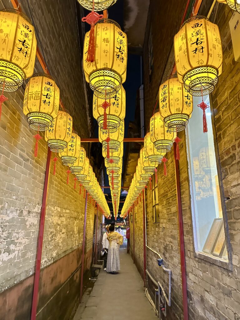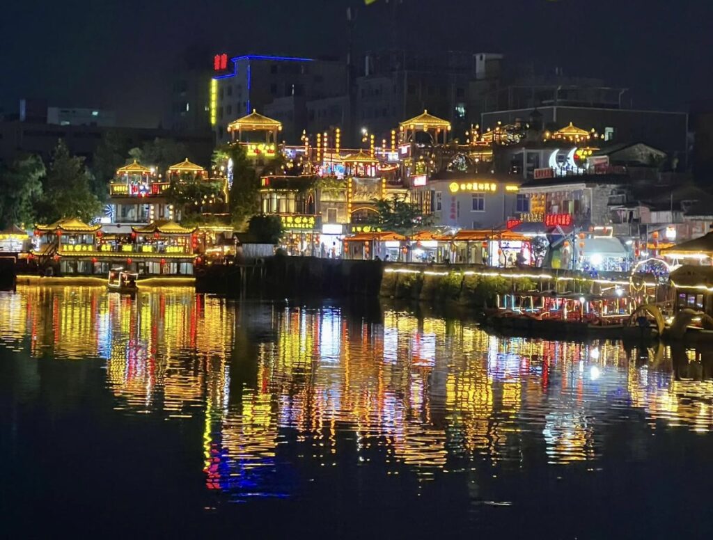 It came alive after dark with people hiring Hanfu (ancient costumes) to pose for photos or wandering around the local craft shops. It’s also a popular spot for evening strolls around the large lotus pond, the reflection of which lit up the night.