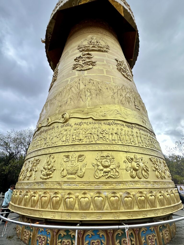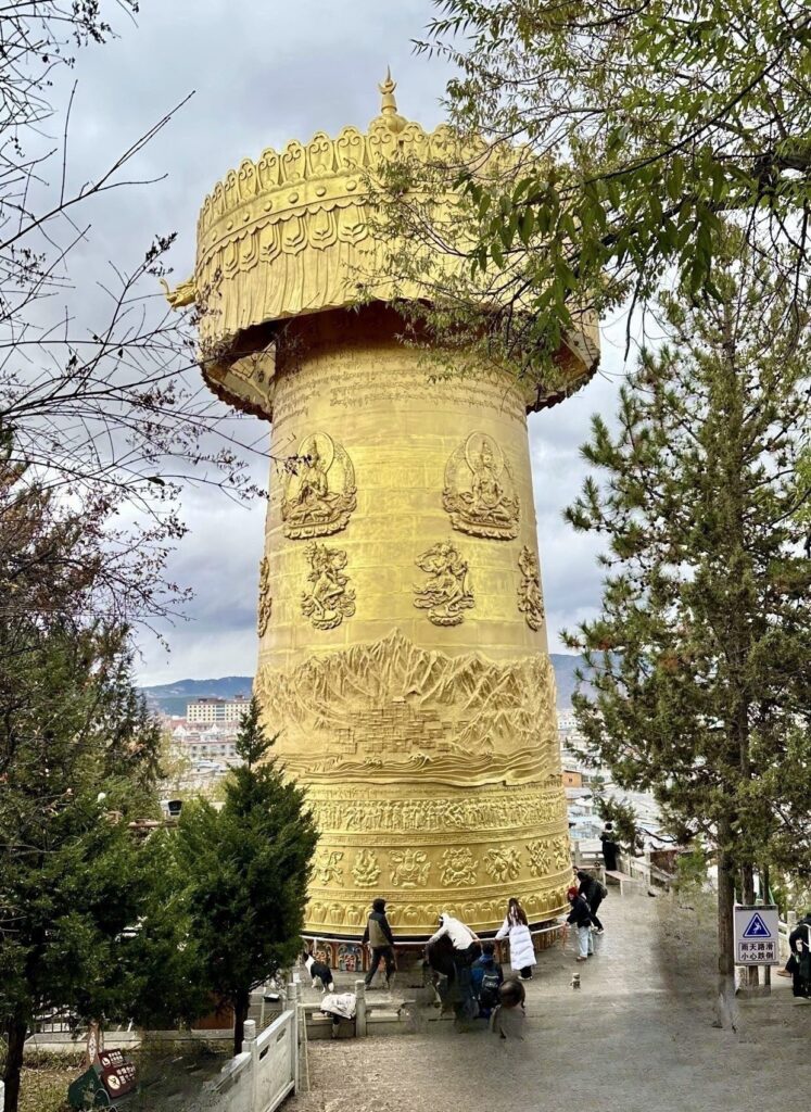 The prayer wheel is an enormous, golden 24-metre-tall structure, the largest in the world. It is located near the Tibetan Big Buddha Temple atop Guishan Park . It can be spun clockwise for good luck, but it needed multiple people to move it at once due to its size and weight.